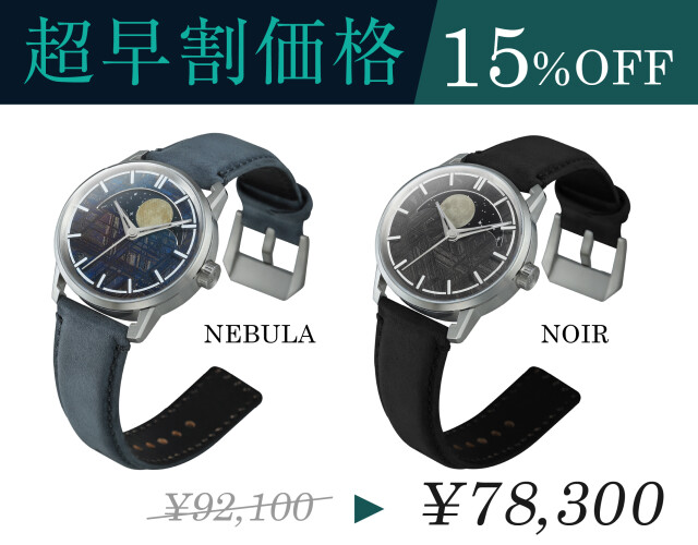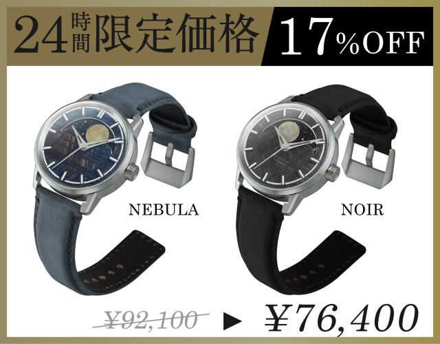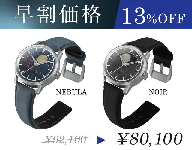 ![]() NEBULA(ネビュラ)「ネビュラ」は、銀河からインスピレーションを得た青いメテオライト(隕石)の文字盤が特徴です。手作業によるエイジング加工で質感を際立たせており、一つとして同じものはありません。これは、星間物質のありのままの姿を映し出しています。