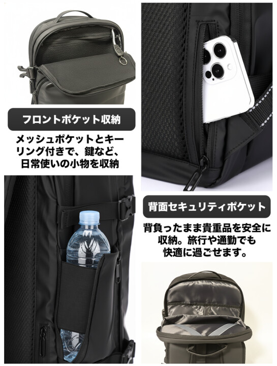 シンプルな外観の中に、貴重品を守るための工夫を詰め込みました。 通勤・出張・旅行――あらゆる場面で『安心を持ち歩ける』バックパックです。