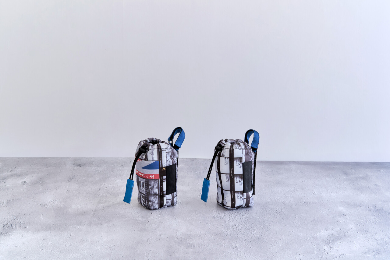 『コンタクトプリント生地タイプ』は、裏地を表使いできるよう綿を貼ってボリュームを持たせ、同じくコードエンドのレザーとナイロンテープをスカイブルーに変更しています。裁断される部分によって仕上がりが異なるため、シックなモノクロ写真柄になるか、メッセージやコラージュ入りの賑やかな柄になるかは、届いてからのお楽しみです。