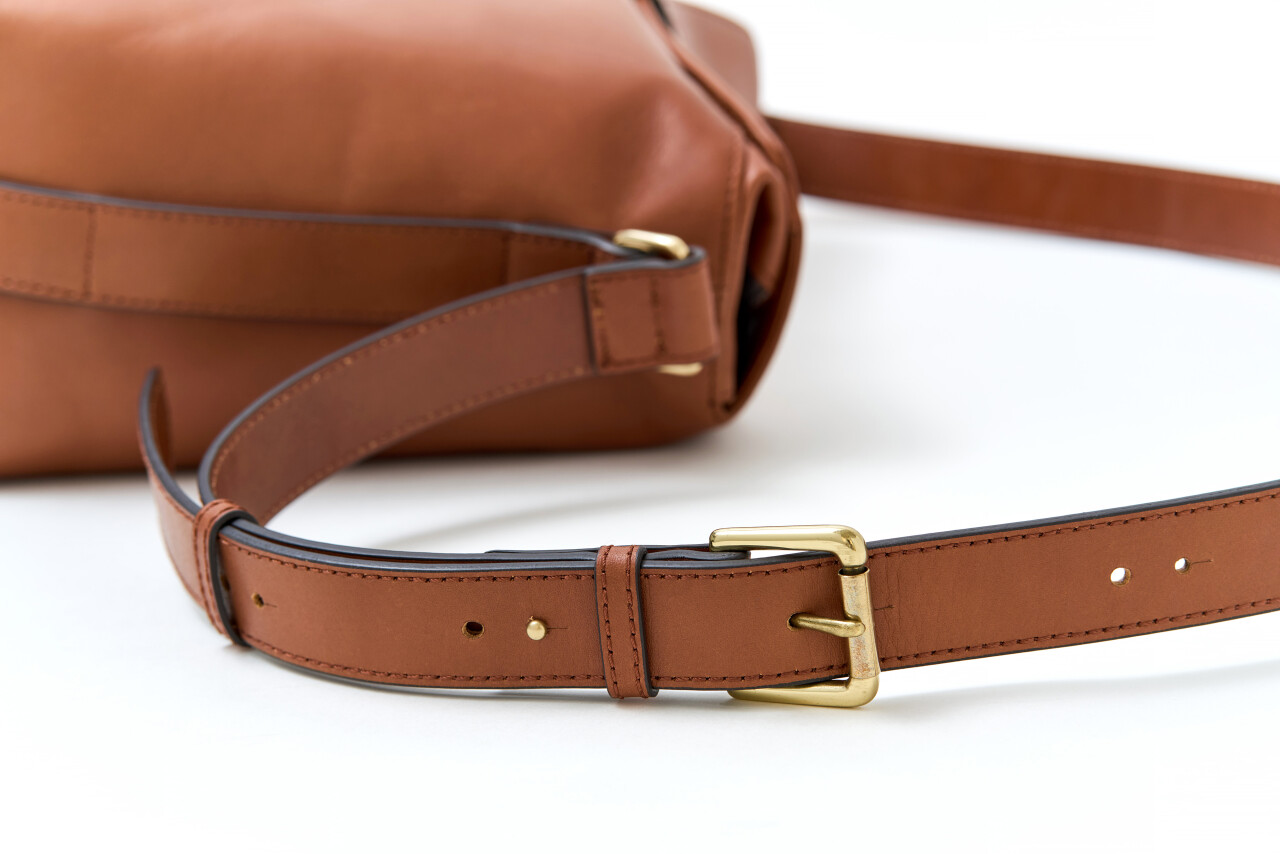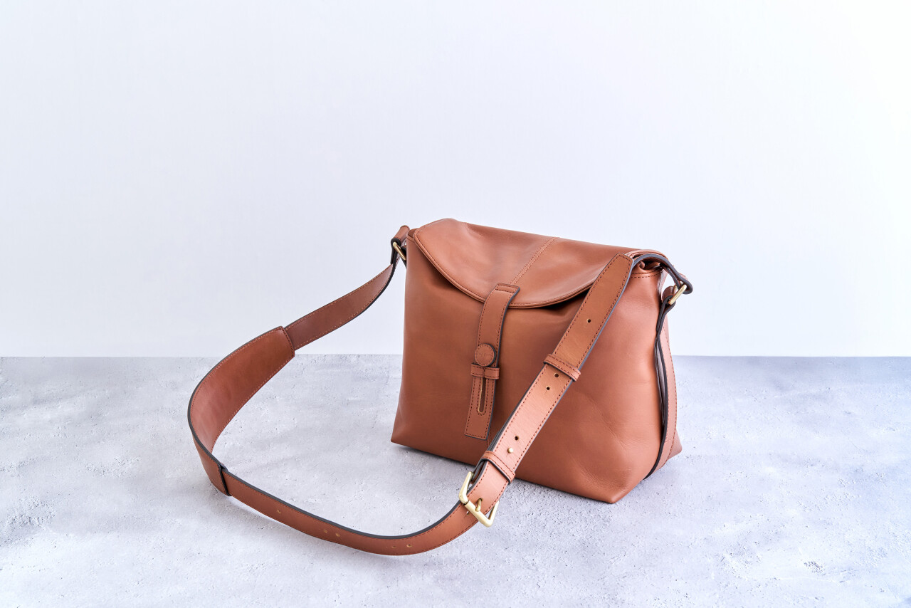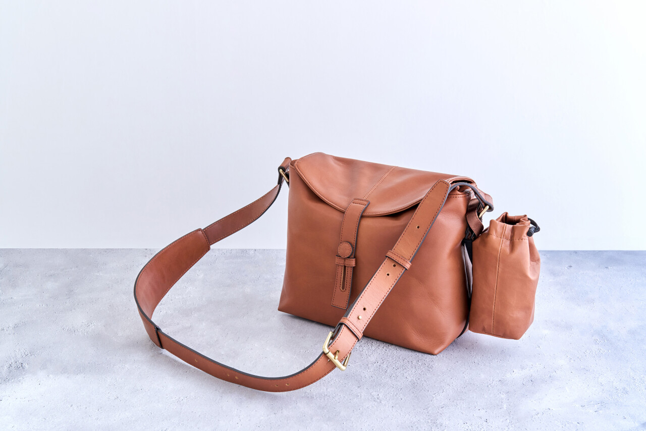 その理想の質感を実現するために、2種類のステアレザー(牛革)を組み合わせています。バッグ本体とベルトの表面にはソフトでありながらしっかりとした繊維質のカウハイドレザーを、ベルトの裏面にはじっくりと鞣されたベジタブルカウハイドレザーを採用し、それぞれの素材の特性をコンビネーションしています。この2つの革は天然の肌キメが感じられる染料素上げと言われるオーセンティックリアルレザーで、顔料で表面を覆った“化粧をしたレザー”とは対照的な、いわば“すっぴんのレザー”とも言える風合いを持っています。