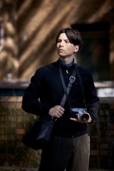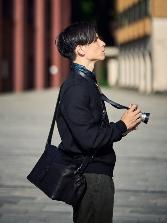 ブラックブラスは、下記の写真でモデルさんが持っているブラックペイントのカメラや、ブラッククローム、特色のグレートーン系のリミテッドカメラなどとの相性が抜群です。バッグ全体がほぼ黒く塗りつぶされた外観になる為、スナップシューターとして街に紛れていくイメージをお持ちの方におすすめしたいモデルです。