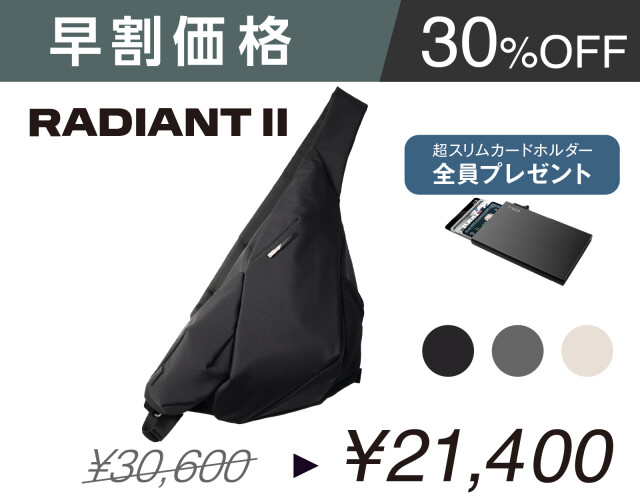 予定小売価格¥30,600(税込み)より¥12,200お得です! 【セット内容】 ・Radiant II Sling Bag ・Auxiliary Stabilizer Strap 【カラー】 ・Black Diamond Grid ・Grey Shadow Grid ・Off-White Grid 【プレゼント】 ・超スリムカードホルダー ※Radiant IIは機能・デザイン性から右肩掛けのご使用になります。 ※製品の仕様、デザインに関しましては一部変更になる可能性がございます。ご了承ください。
