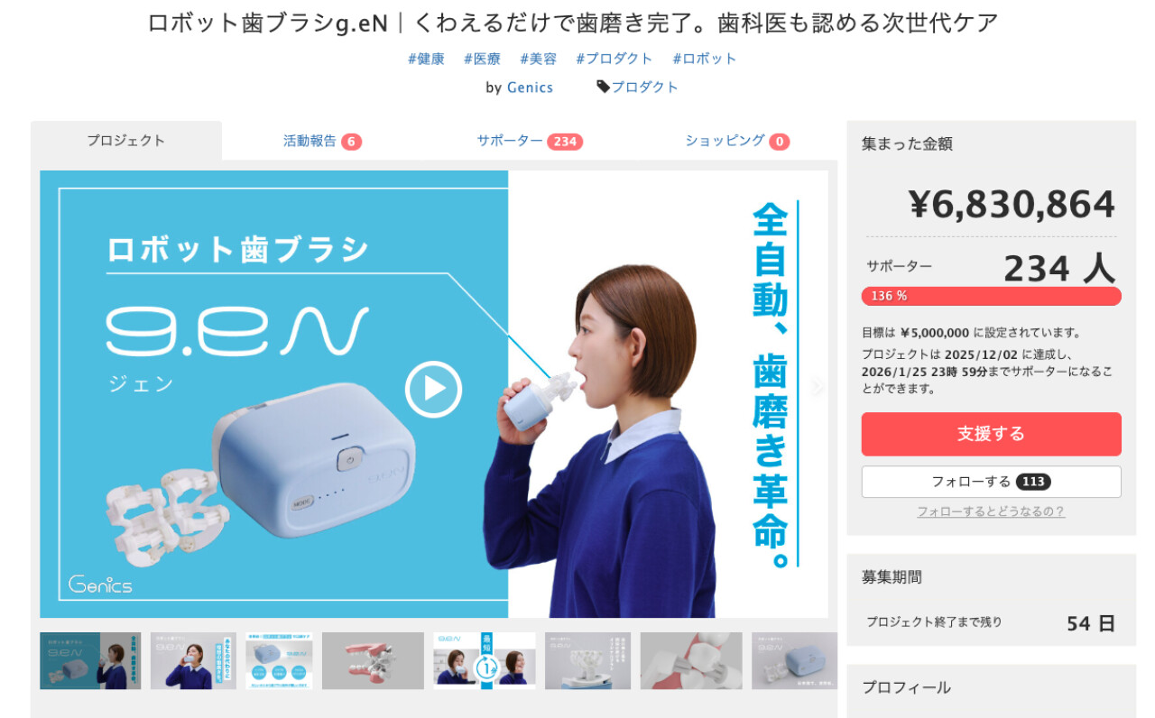 内容・時期についてご相談後、セミナー開催時期を決定させて頂きます。 ロボット歯ブラシg.eN スターターセット×3セットについて クラウドファンディングは、プロジェクト終了後に生産個数が確定となり、これ以降に生じる以下の理由によってお届け時期が変動する可能性がございます。恐れ入りますが予めご了承の上ご支援ください。 ・製造上の予期せぬ問題 ・想定以上の支援数による計画の変更 ・輸送手段の変更 ・他、自然災害など不可抗力要因 尚、お届け時期に変動が生じる場合は、随時「活動報告」を通してご報告させていただきます。